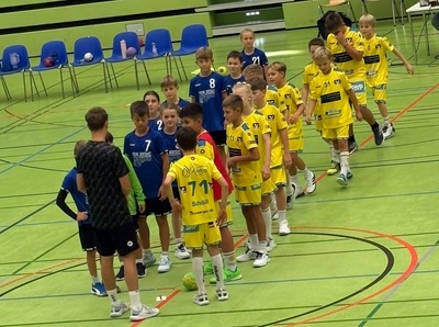 E1 erneut erfolgreich20:10 gegen den HC NeuenbürgAuch im zweiten Spiel konnte unsere e Jugend überzeugen. Bis zur Halbzeit tat man sich aber mit den gut aufgelegten Gästen aus Neuenbürg schwer. Lediglich mit einer 9:8 Führung ging man in die Kabine.