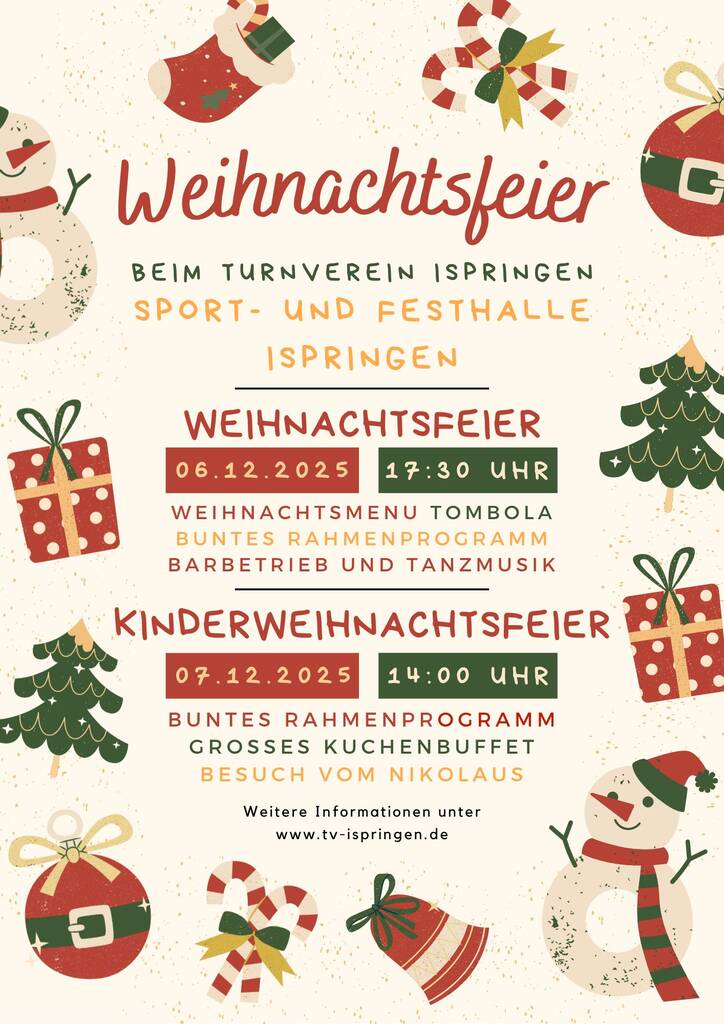 Der Turnverein lädt herzlich zur öffentlichen Weihnachtsfeier am Samstag den 06. Dezember und zur Kinderweihnachtsfeier am Sonntag den 07. Dezember in die Sport- und Festhalle Ispringen ein.